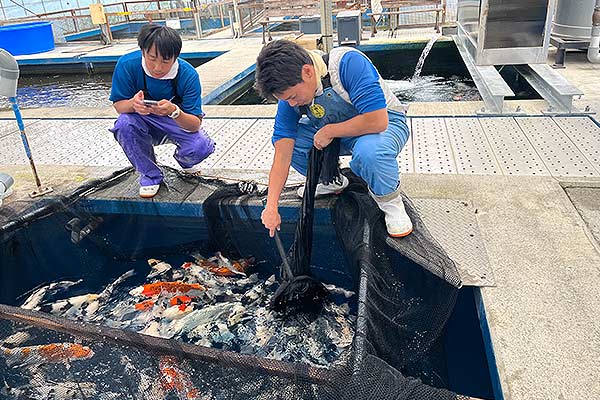 色や模様によって数多くの品種に分けられている錦鯉の中でも、「白」と「黒」で模様を成す「白写り」は、面迫養鯉場にとって大変重要な品種です。